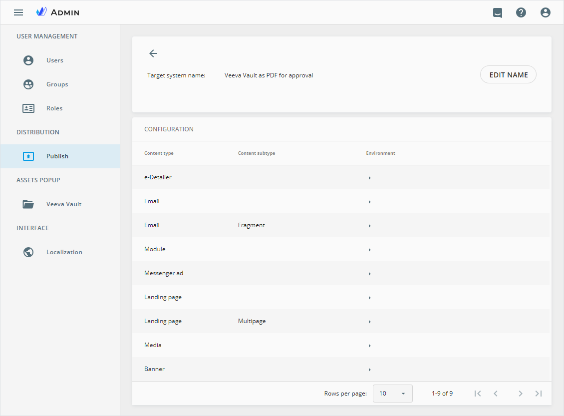 In the target system list, click Veeva Vault as PDF for approval to open its settings page.