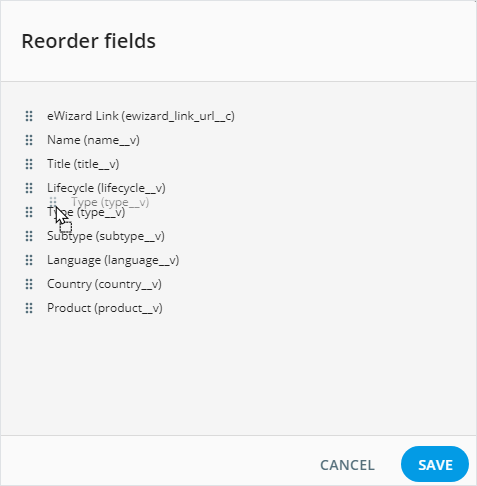 Reorder fieldspopup that appears, drag the fields to other places in the list.