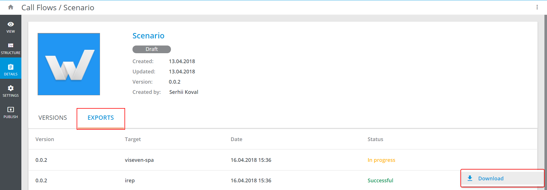 The export status can be viewed in the EXPORTS tab of the Call Flow's Details. Successful export builds can be downloaded via Download option in the more options menu of the build: