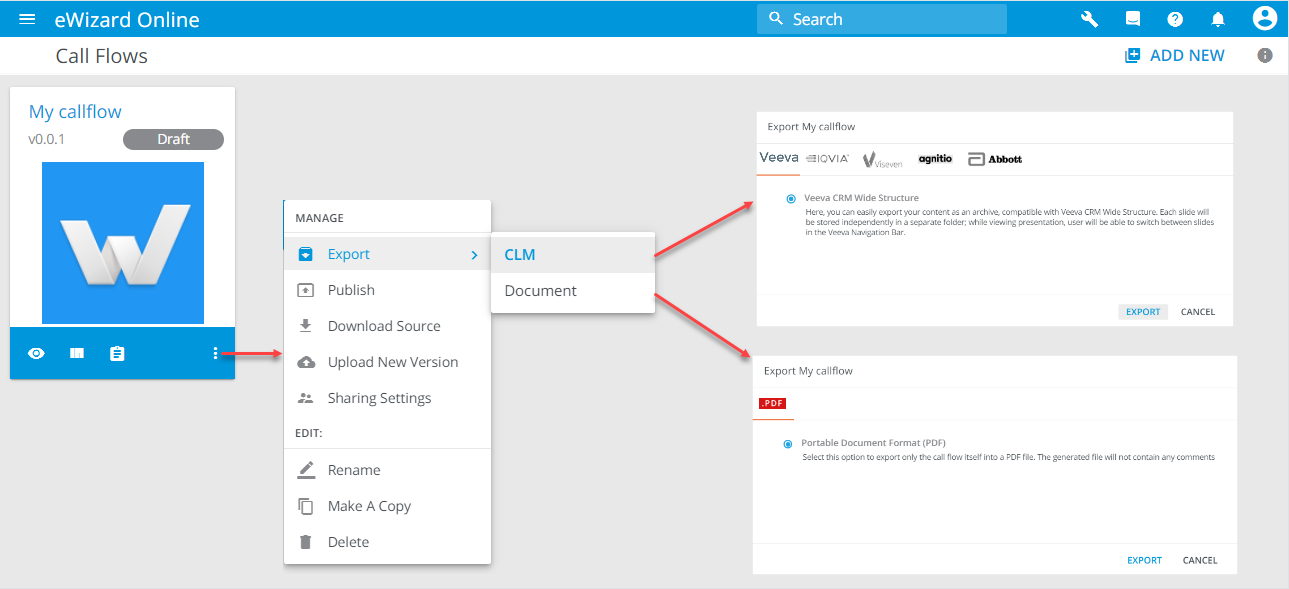 You can export call flow to CLM or Document. To do so: