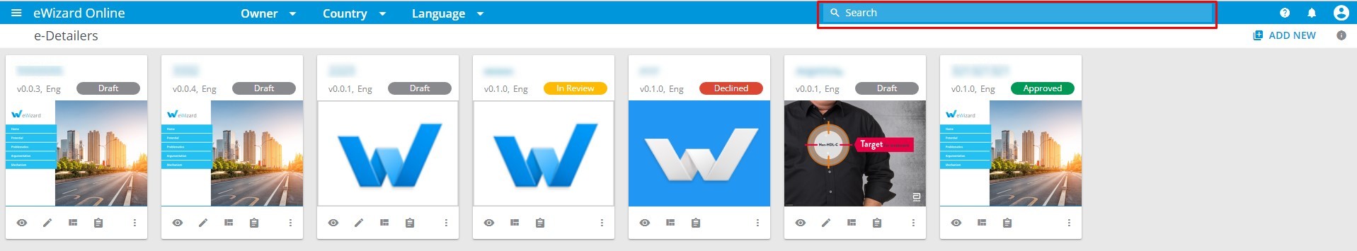 eWizard allows you to quickly find necessary content via search and filtering of the existing e-Detailers.