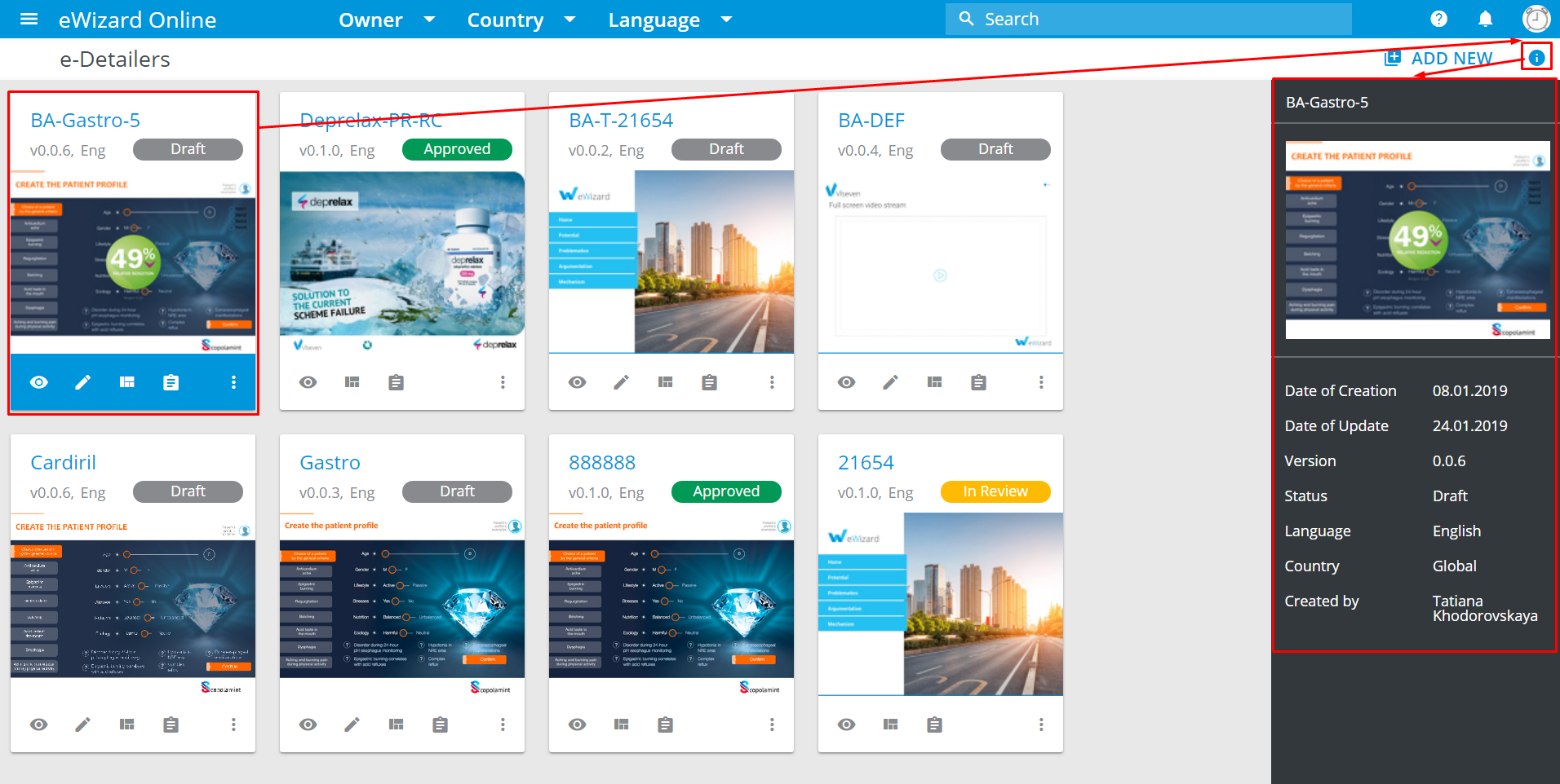 e-Detailers are the presentations you create to promote pharmaceuticals. This section describes how to create new presentations, upload template-based ones, convert Power Point presentations into e-Detailers. You will know how to copy and edit e-Detailers, change their structure, view slides, export presentations in the required format, publish or share them, and also how to set up KPI gathering.