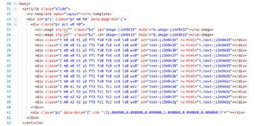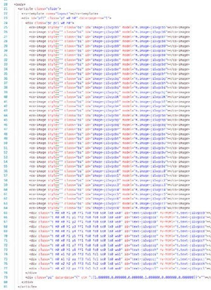 All composite elements of vector graphics were rendered as separate elements, so that the resulting code structure is enormously bulky: