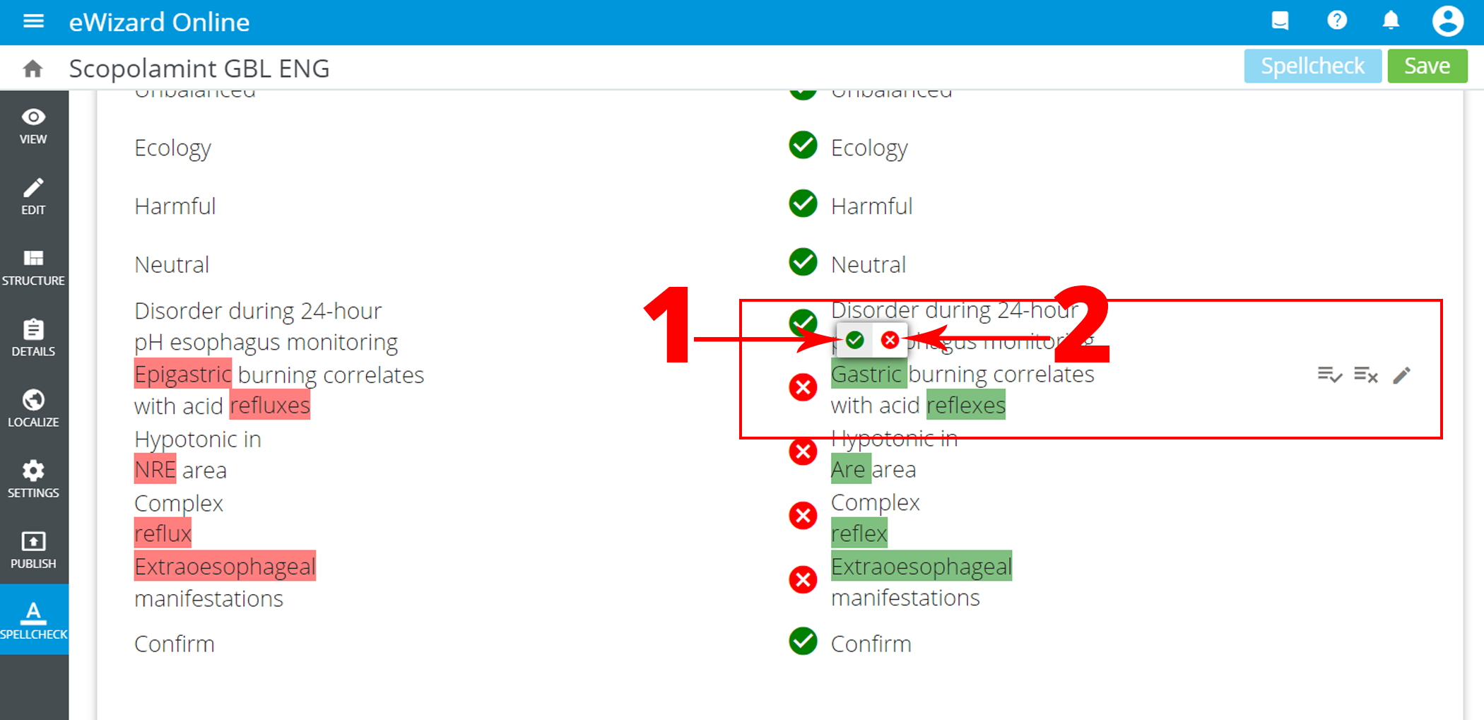 For quick correction, hover the mouse over the exact suggestion. Two controls appear above it: the green tick [1] and red cross [2].