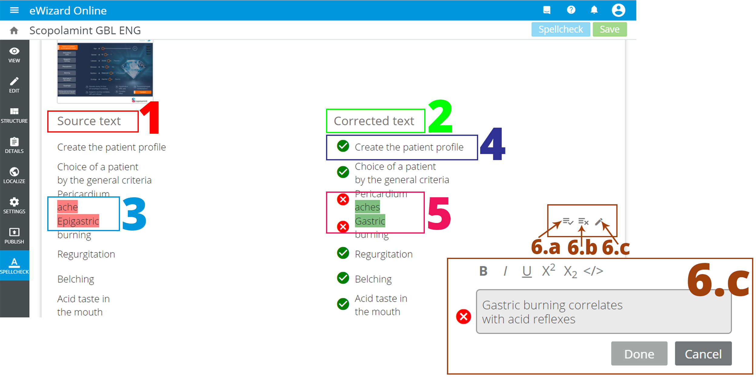 To decline the correction and leave the highlighted word as it was originally, click [6.b].