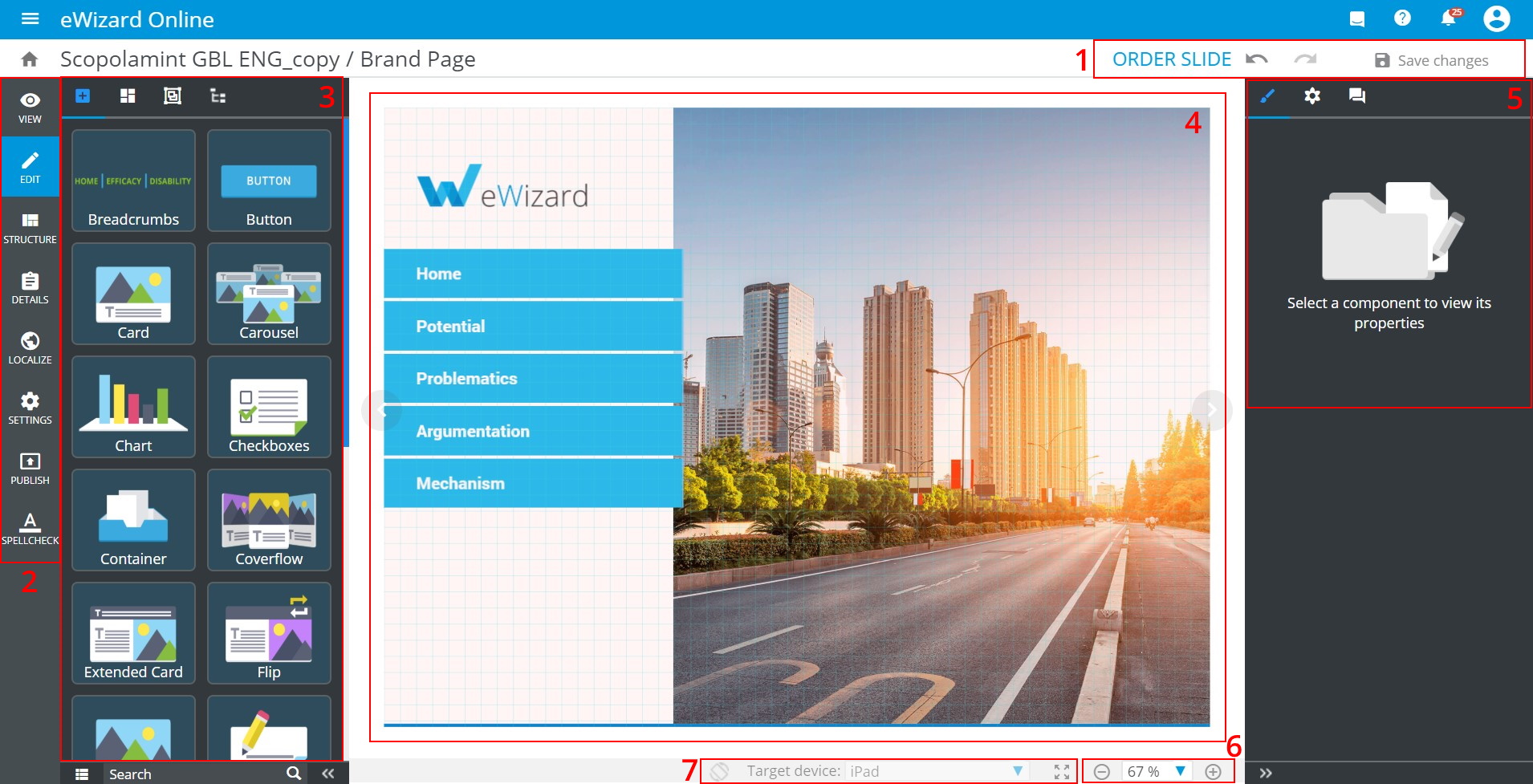 The tools sidebar [5] with properties, general styles, and comments.