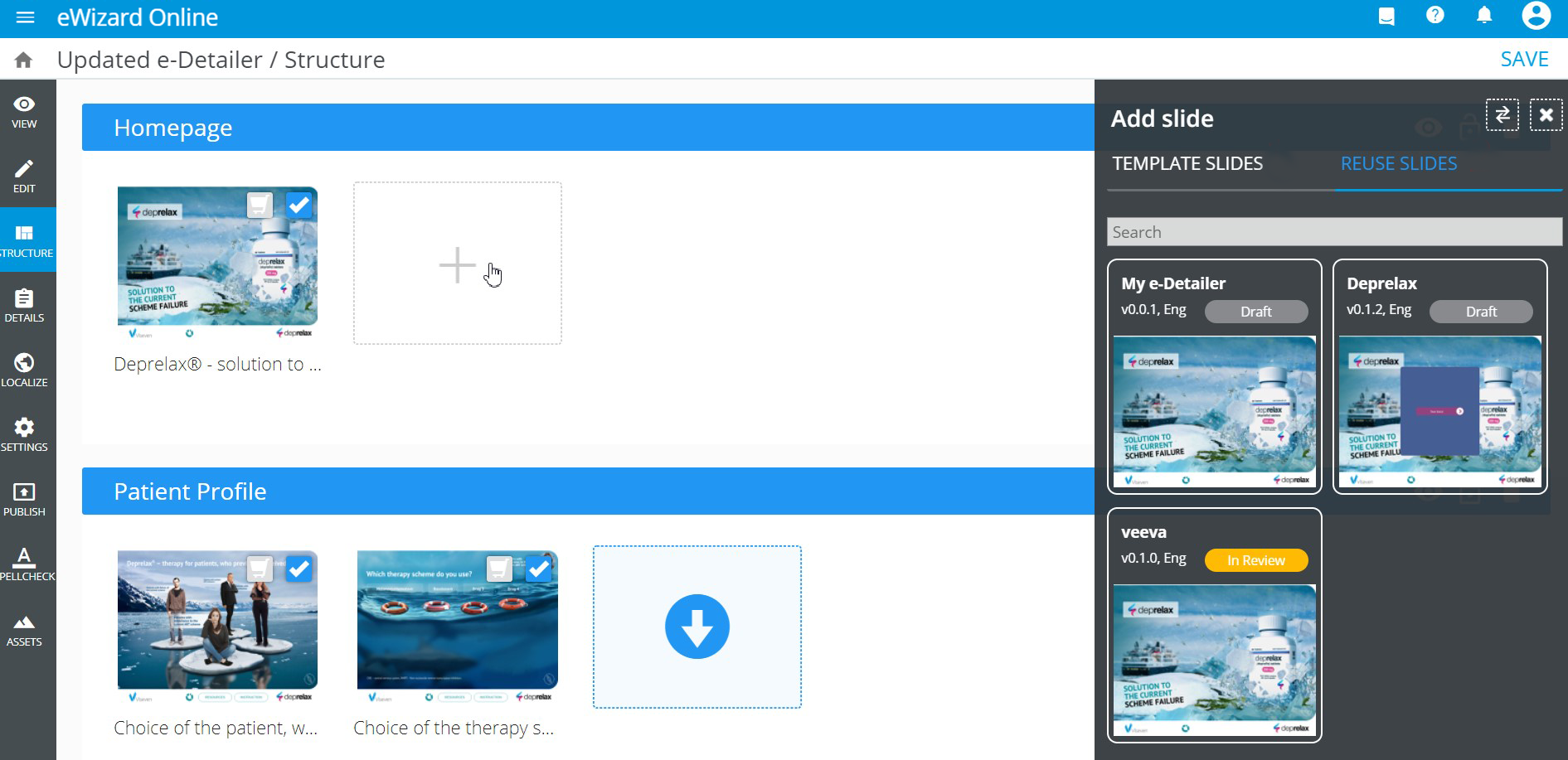 Reuse slides are the slides from other e-Detailers in your Library based on the same template.
