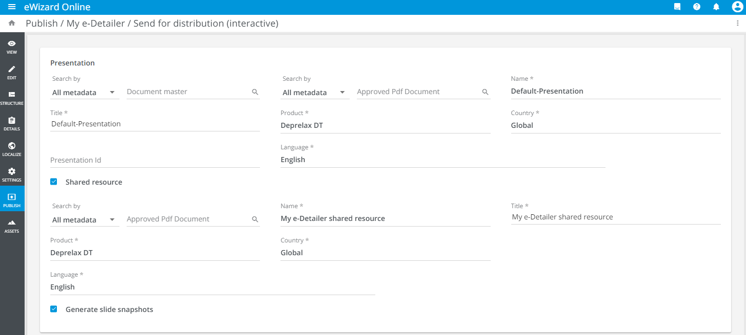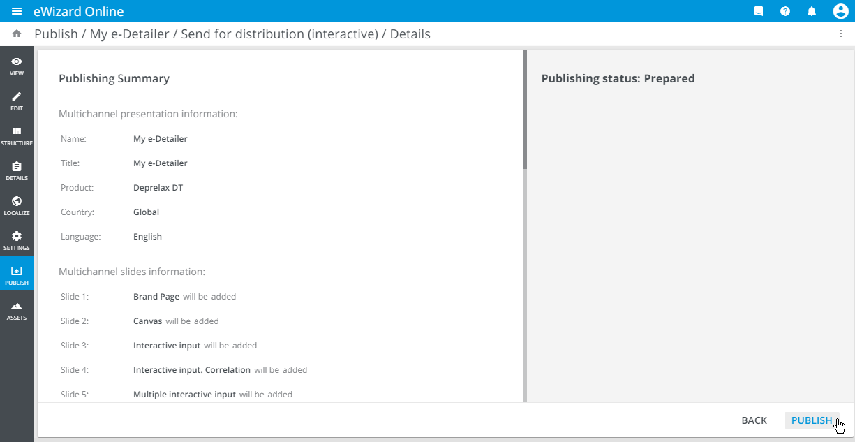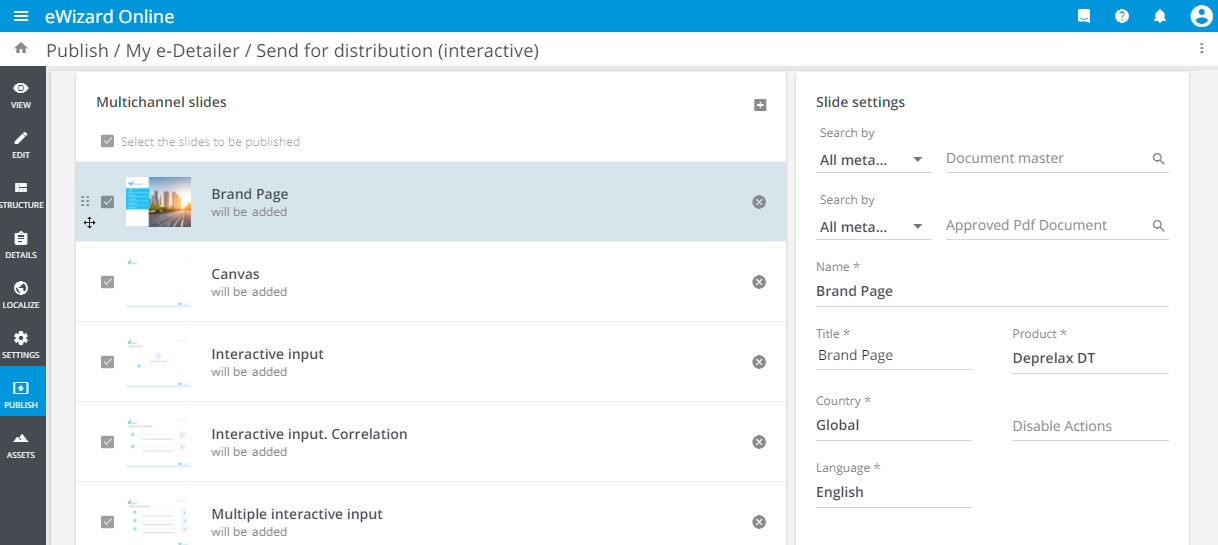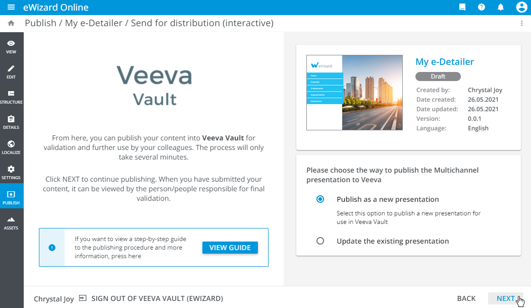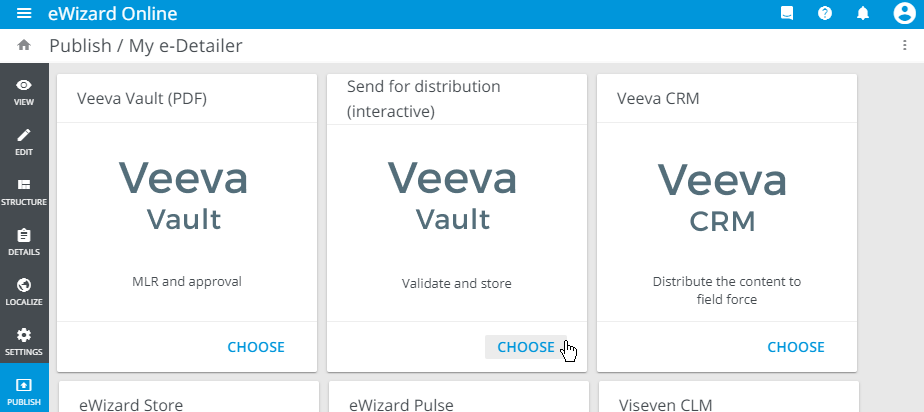 To publish the e-Detailer to Veeva Vault as interactive, perform the first steps and proceed to the following: