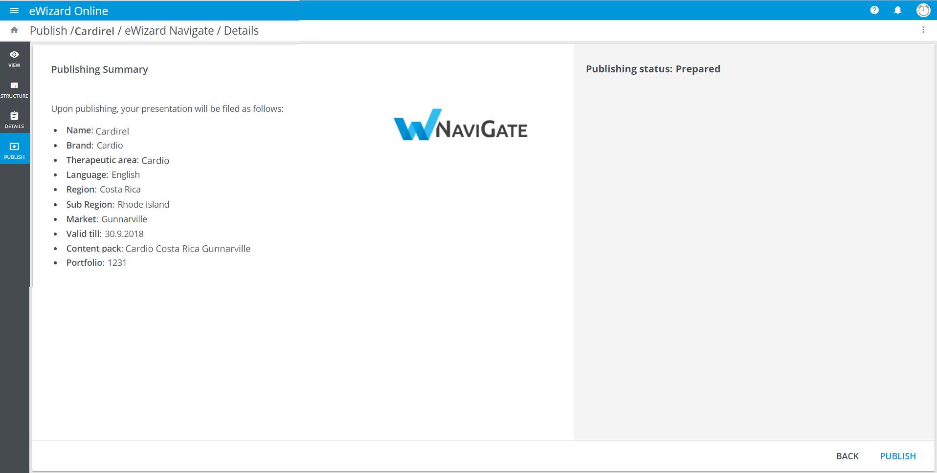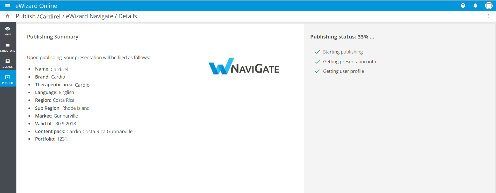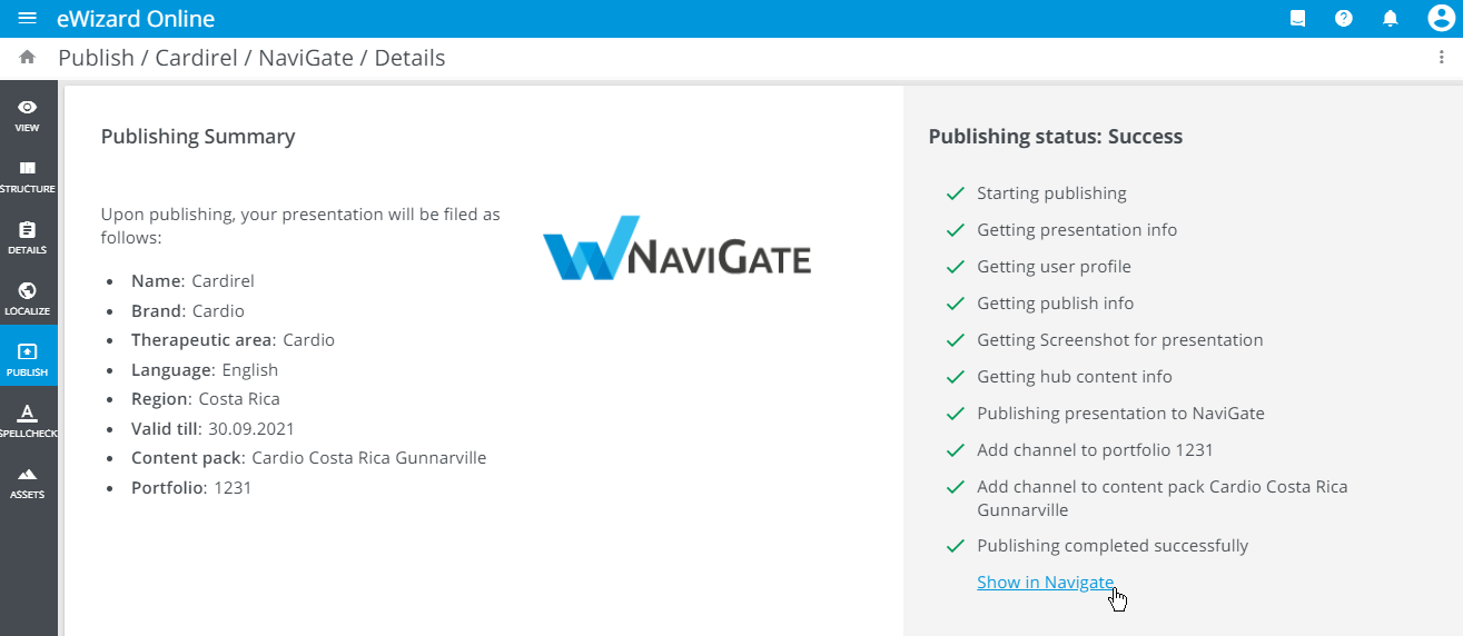 Once the publishing process is complete, you receive the result message. Click the link to view the published e-Detailer in NaviGate (for successful publication):