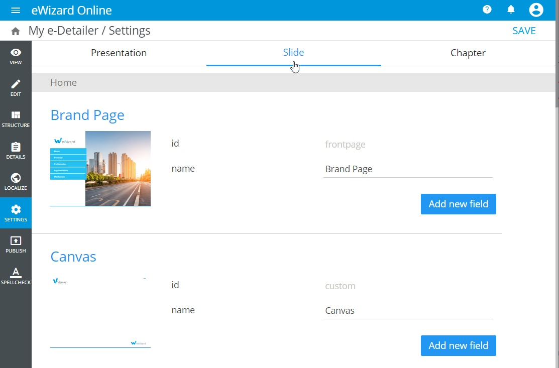 The Slide tab contains the settings for each individual slide of your e-Detailer:
