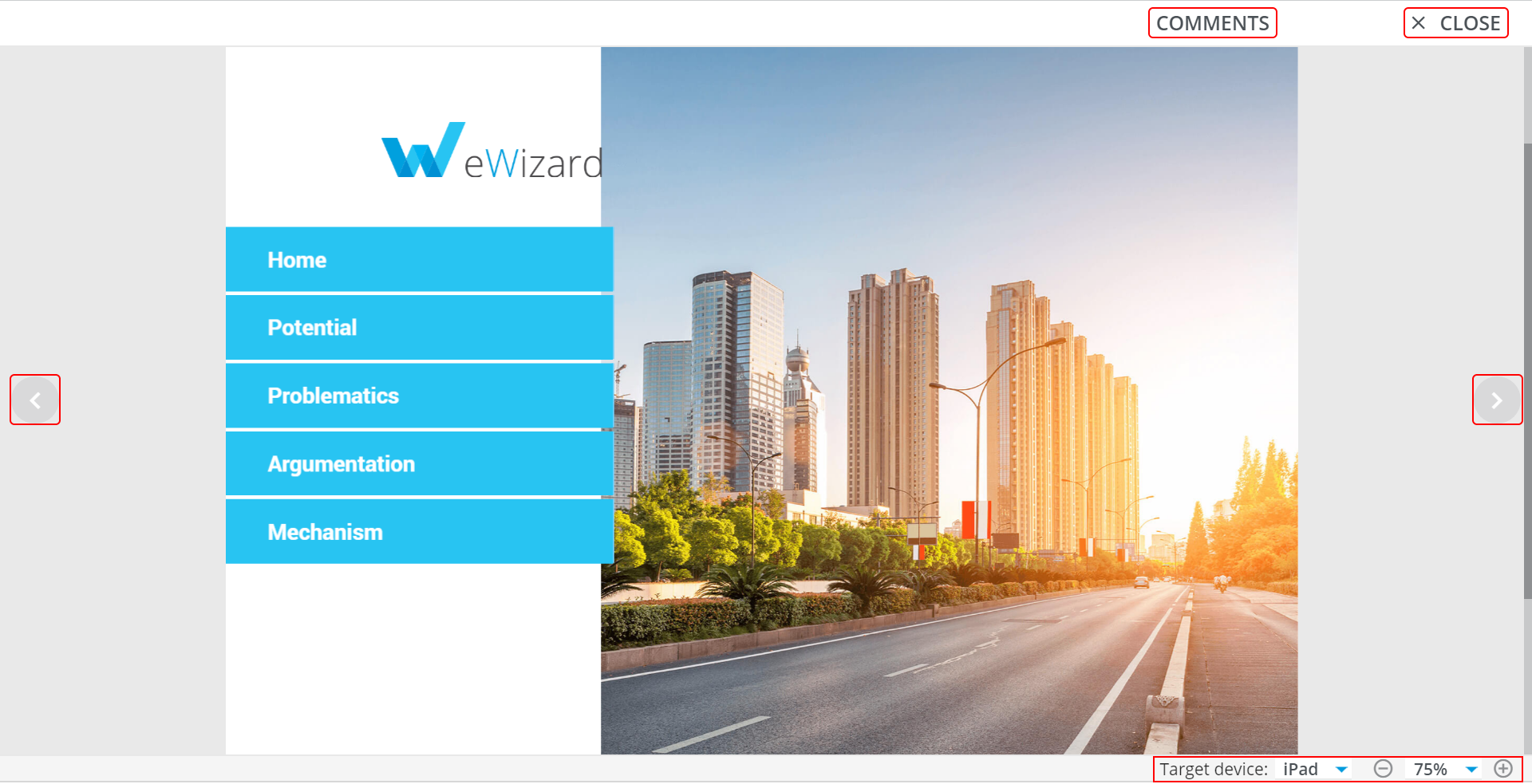 Target deviceselection allows viewing the presentation on different target devices;the scaling tool allows changing the scope;