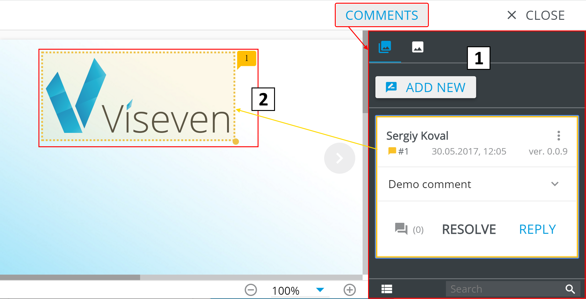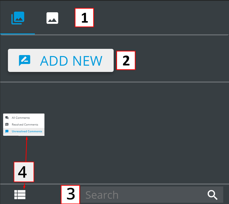 In the Search field (3) you can search the specific comment, and the Filter menu (4) that allows filtering the comments displayed.