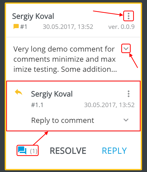 More options () menu allows operating with comments or replies: