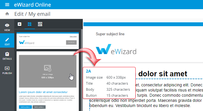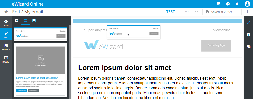 The Block is a group of components, which are tied in one container. The Blocks tab is on the email elements panel. To add a block to the email, just drag it to the layout: