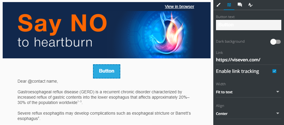 Button text: type the text to be displayed on the button. ToggleDark backgoundON when your button text isn't clearly visible in this box.Link: the link you add here is used to redirect email recipient once they click the button.Enable link tracking: select this checkbox to log this button clicks within your recipient email client.Width: fit the button width to text or allow the full layout width.Align: locate your button in the center of the layout, to its right, or to the left.