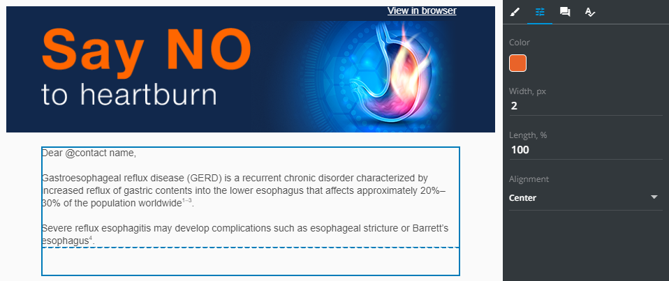 It is the separation line which logically splits the content. Go to Properties to set the line's Color, Width, Length, and Alignment: