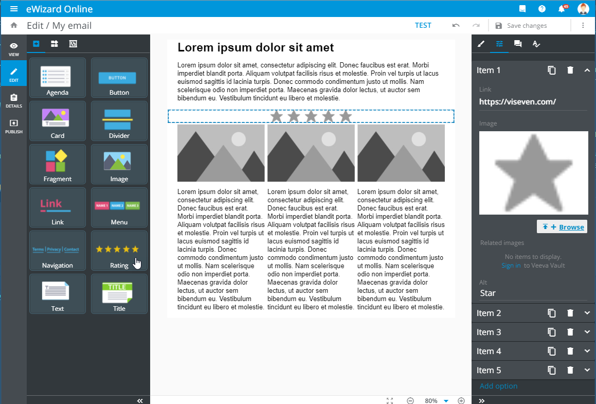 The Rating component is the collection of items for retrieving a feedback from the email recipients. Refer each rating items to a unique link that can be tracked in the CRM system. In this case, the recipient interaction with the Rating component is recorded in a dedicated CRM report.
