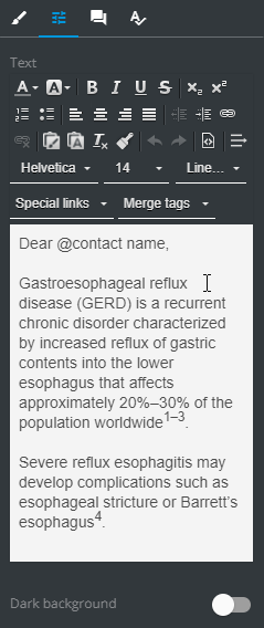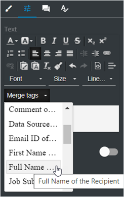 | Decrease the text left indent | Add merge tags | ||
