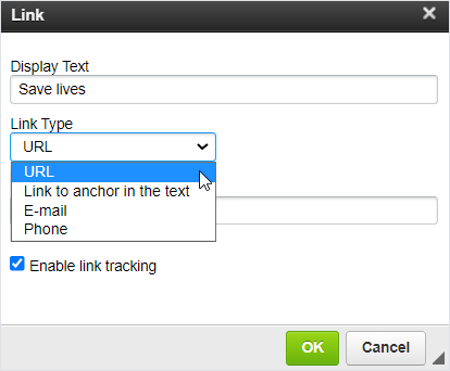 | Link to anchor in the text | Redirects to the particular part of your email | Preset the anchor before using this link type |