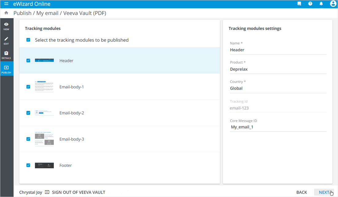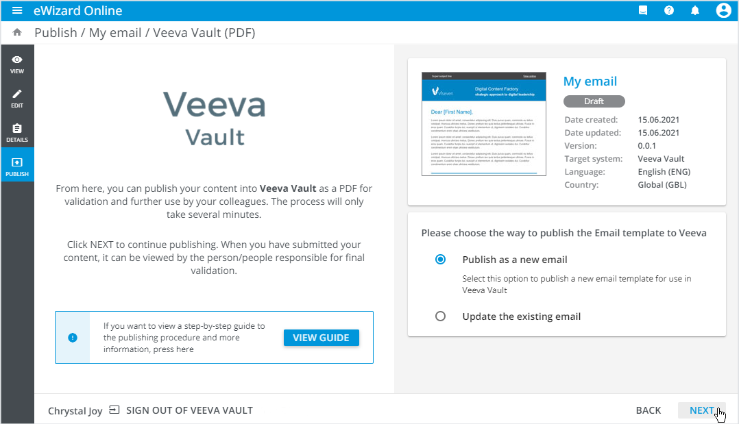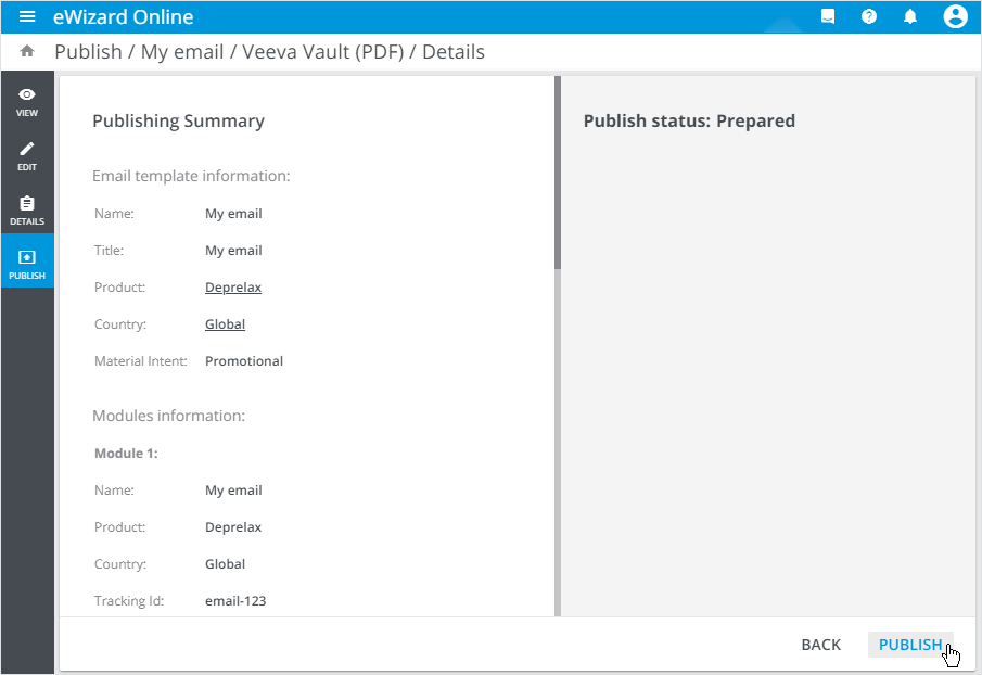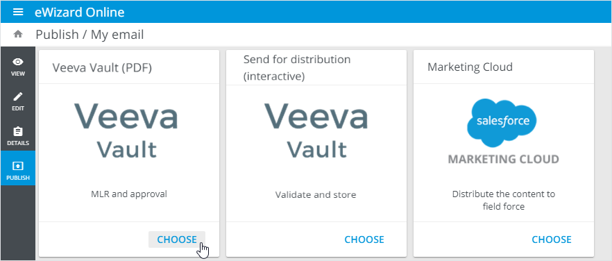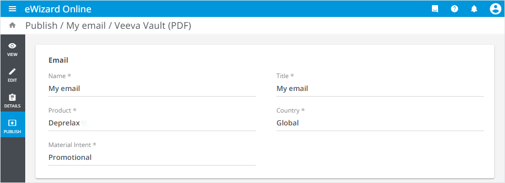 You can send your eWizard emails and email fragments to Veeva Vault for approval. The resulting PDF document in Veeva Vault contains all the required metadata and linked assets.