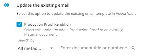 To add your item as a Production proof to an existing Veeva Vault document, select the Production proof rendition checkbox. In this case, you can't change the metadata of the existing document. Your item serves as a reference. Once published, you can find your item under the Renditions section in Veeva Vault.