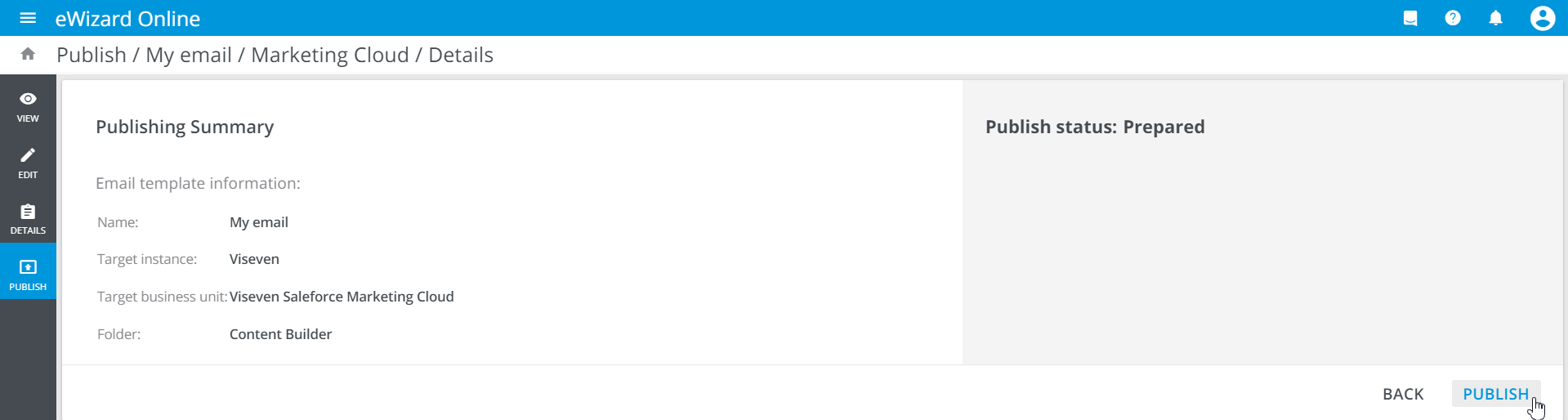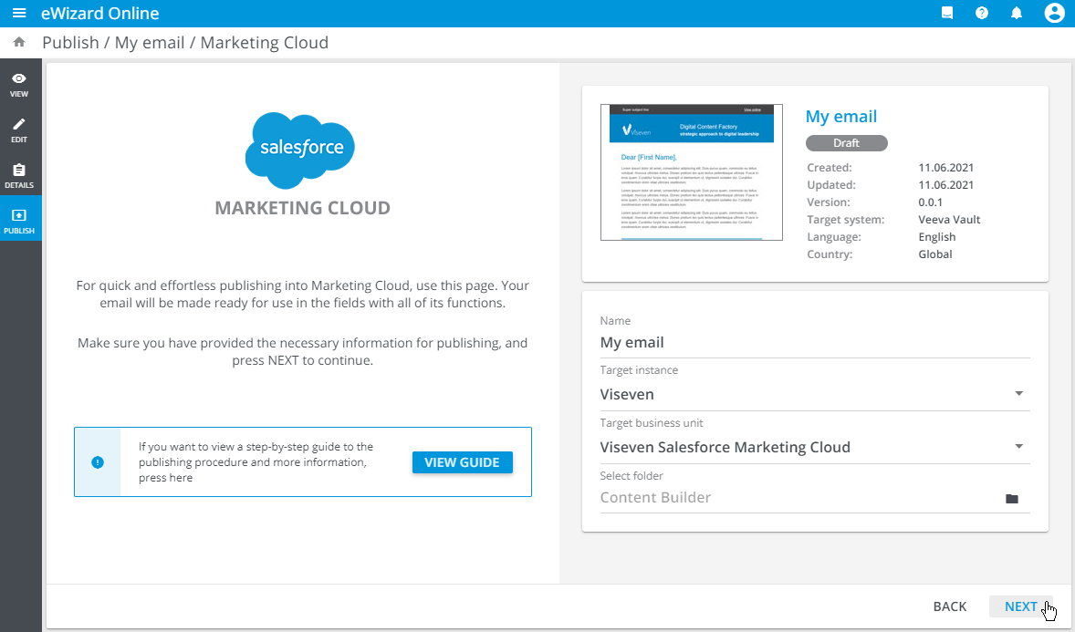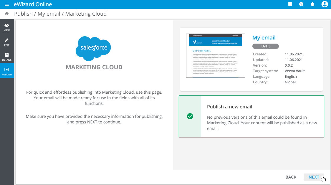 To publish the item to Salesforce Marketing Cloud (SFMC), perform the first steps and proceed to the following: