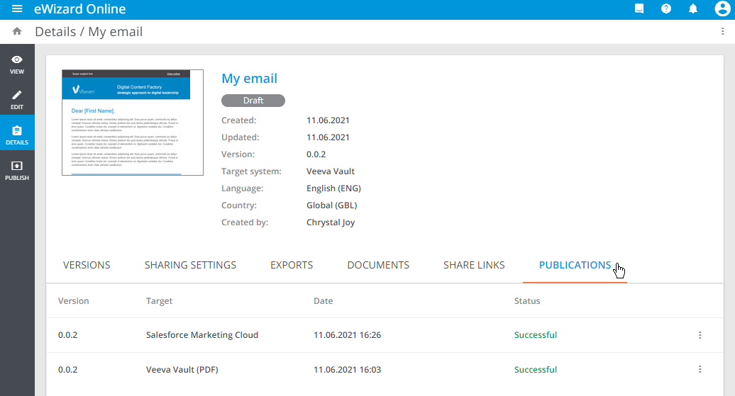 Also, you can view the publication details of the required item under the PUBLICATIONS tab of its Details: