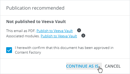 Follow the links in the popup that appears to publish the email and its associated modules as a PDF for approval, if it hasn't been done previously.