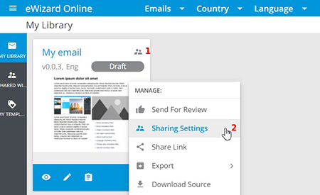To add collaborators to the email and assign them preset roles, go to its Details by clicking the status label () on the thumbnail [1] or unfolding its more options [2]: