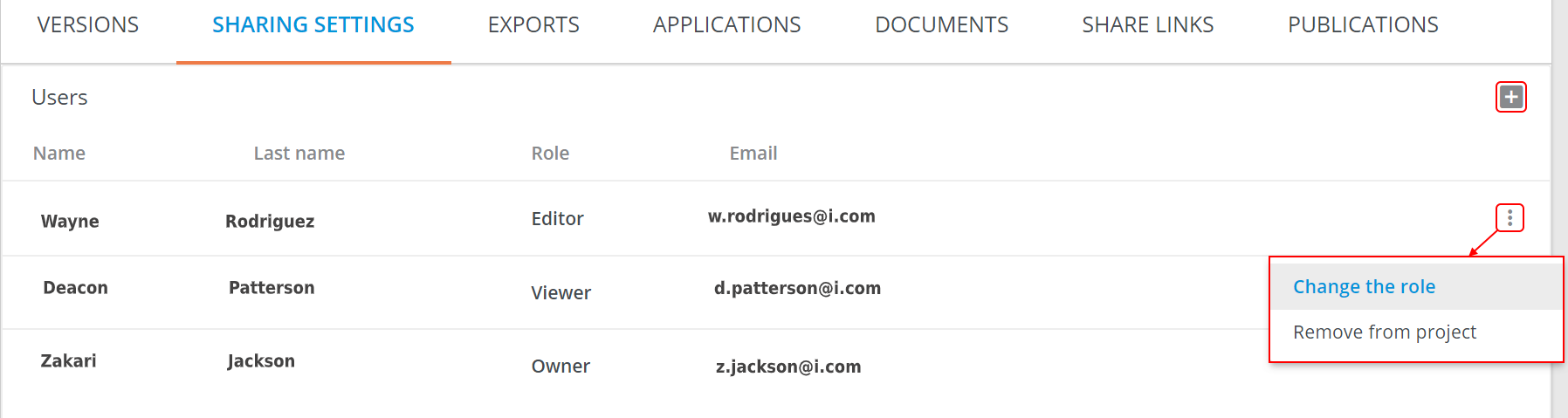 The SHARING SETTINGS tab includes the list of collaborators (the users who can perform the operations with the email in their eWizard accounts), their roles, and email addresses:
