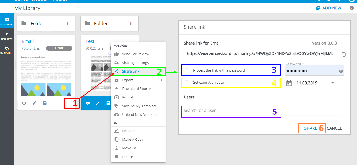 When you need to share an item with somebody, use a share link. Items shared with a link are available for viewing and commenting. However, while the view option is open for any user, commenting is available only for eWizard users who are logged in.