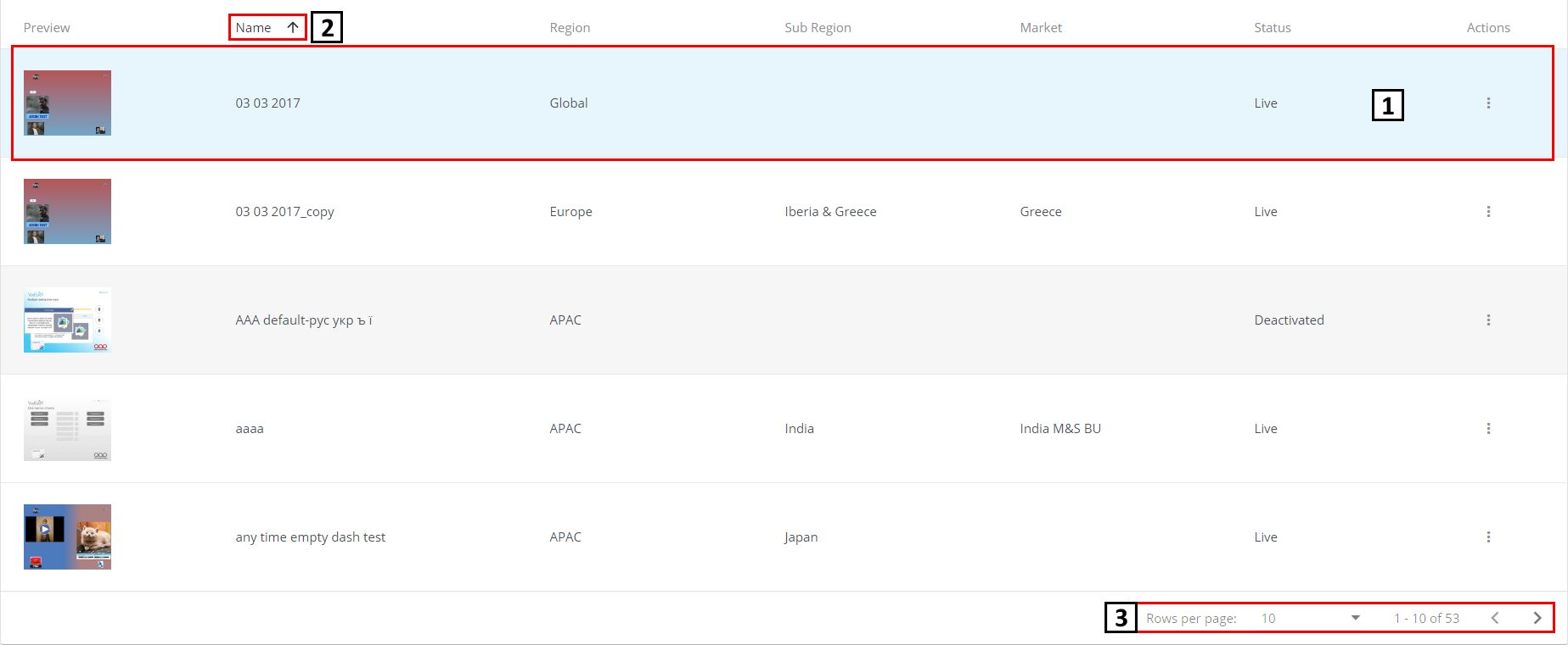 Name. View settings (Rows per page😃 and navigation arrows (previous page – <, next page – >).