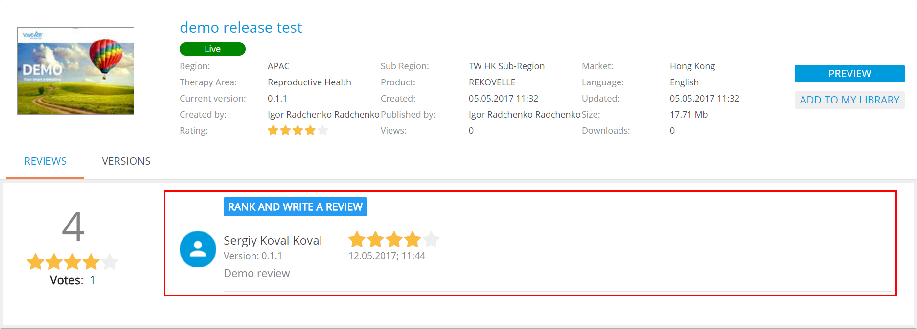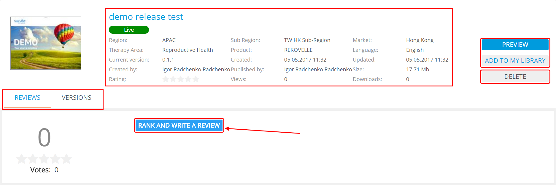 It comprises two tabs: REVIEWS and VERSIONS. DELETE is available only for the presentation owner.