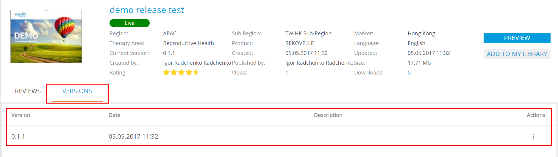The VERSIONS tab contains versions history: