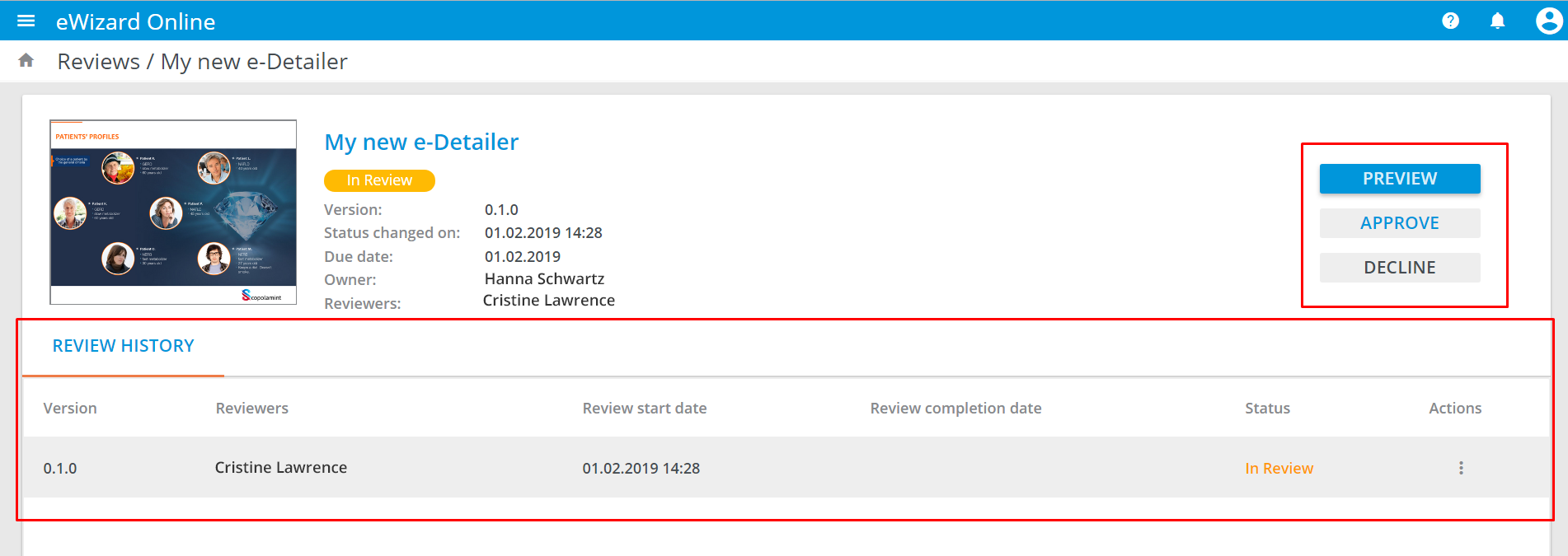 You can view the details of an item on review. You can Preview, Approve, and Decline an item here.