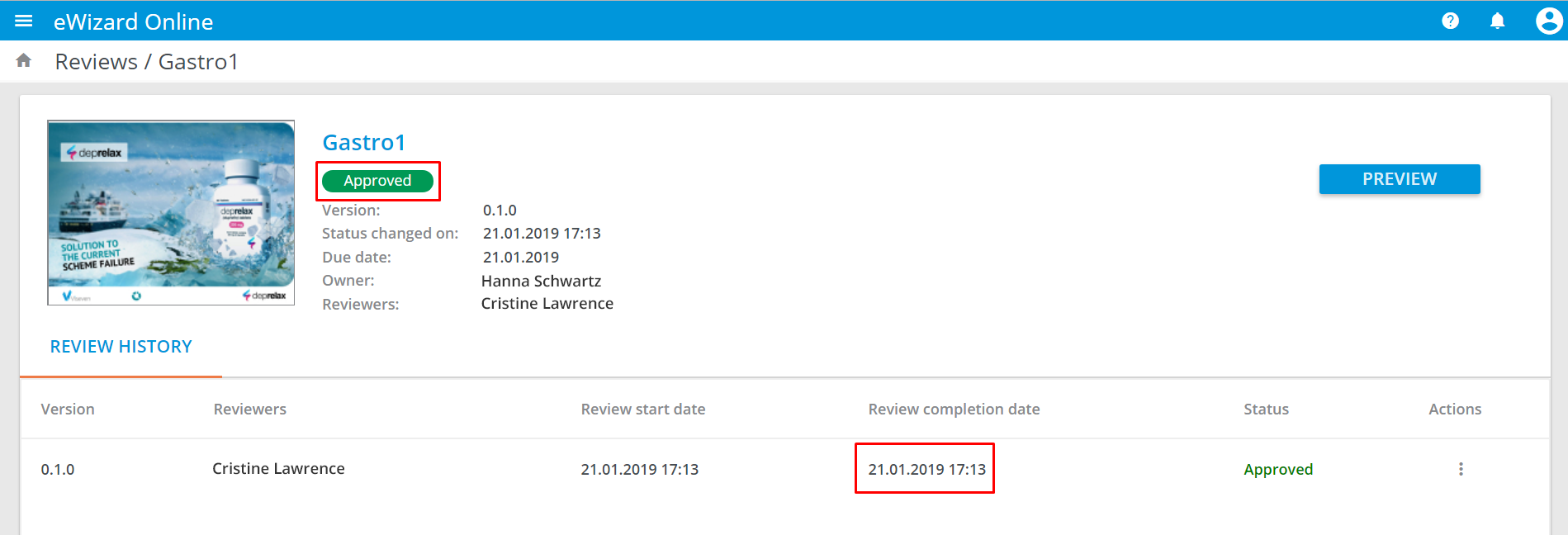 The review completion is followed by the item's version change and appropriate notification. The Review completion date is also updated.