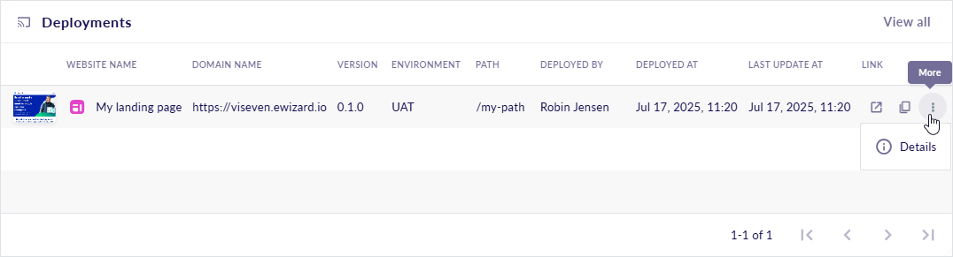[5] The Deployments widget displays up to five records per page of the websites you've exported, with the most recent ones listed first.