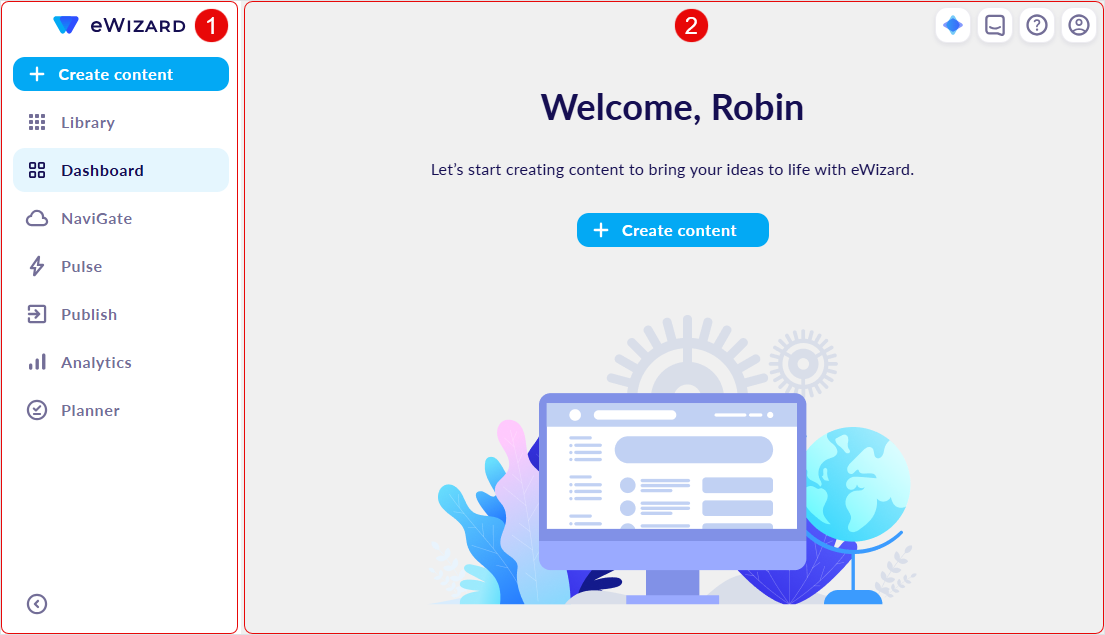 [2] The main Dashboard area serves as your primary workspace in eWizard, featuring a clean, welcoming interface designed to help you get started quickly. It includes a centered + Create content button and controls in the upper-right corner.