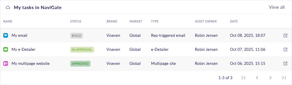 The My tasks in NaviGate widget displays up to five records per page of content items and media assigned to you for review in NaviGate. The most recent ones are listed first.
