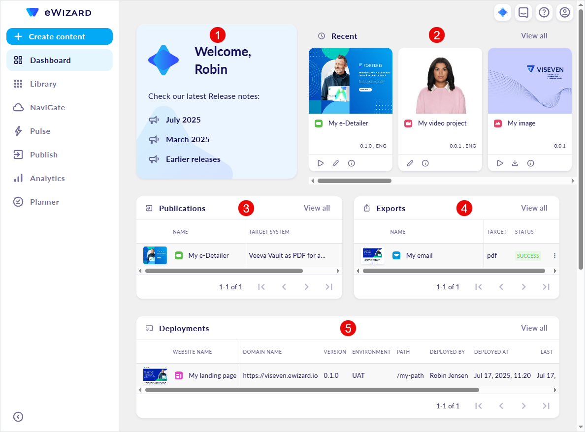 Dashboard is the homepage of the eWizard platform, offering a personalized workspace designed to streamline navigation, surface key content, and enhance productivity across marketing workflows. It can be set as the default landing page after login, providing immediate access to high-priority content items recently edited, published, exported, and deployed. Featuring an intuitive interface and smart categorization, Dashboard simplifies decision-making and daily operations by consolidating essential actions and insights in one place. This reduces the need to search across the platform, allowing you to focus on efficiently creating, reviewing, and sending content items to target systems.