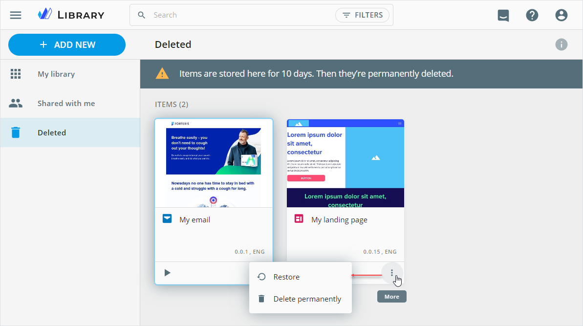 The Deleted space contains all content items and folders you've deleted from Library.
