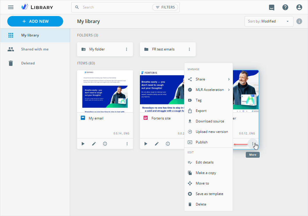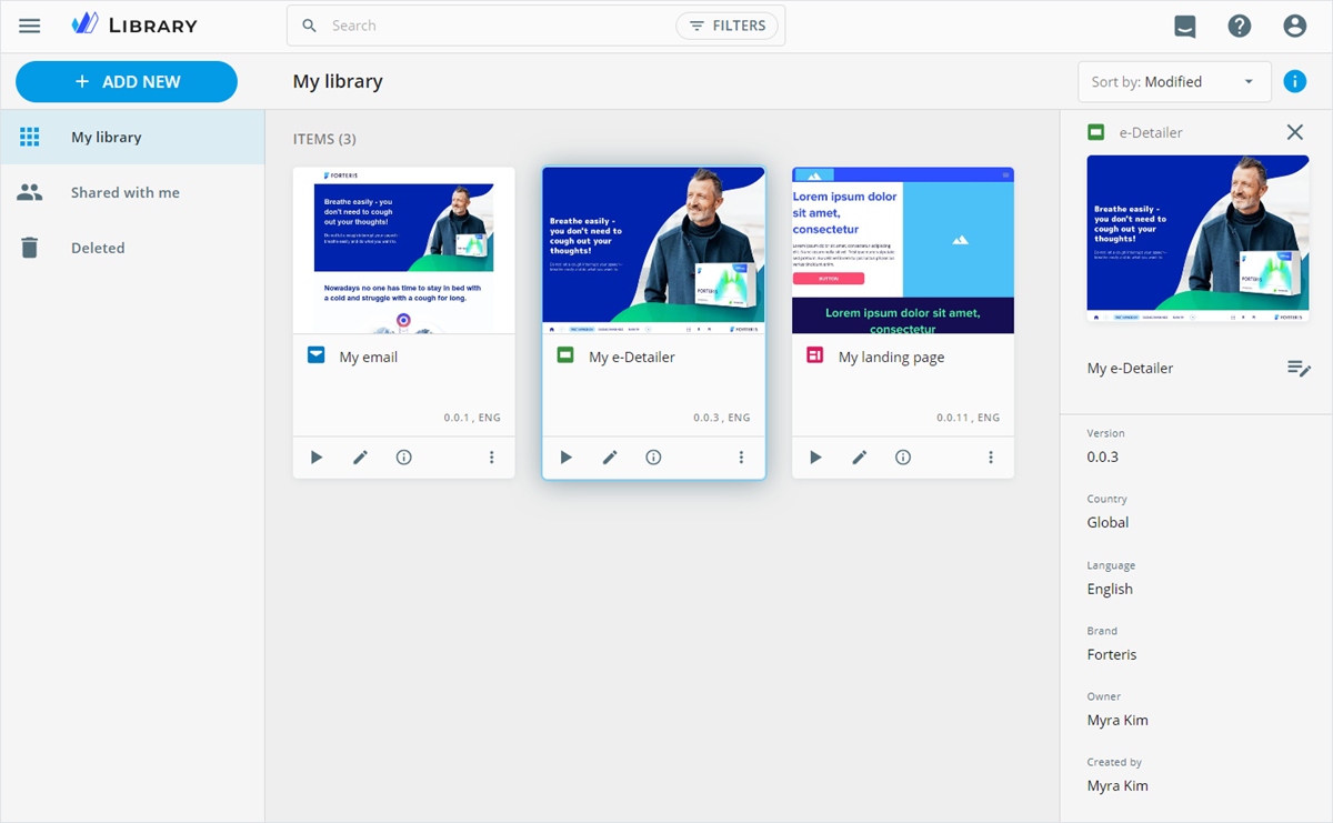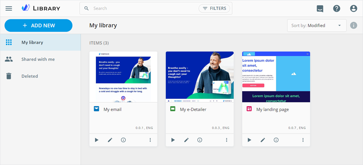 Within My library, you can search, filter, and sort the content items by the required parameters.