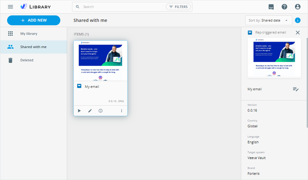Library is a dedicated service for providing access to the content items and folders available for you in eWizard. It comprises three spaces with access to your active, shared with you, and deleted content.