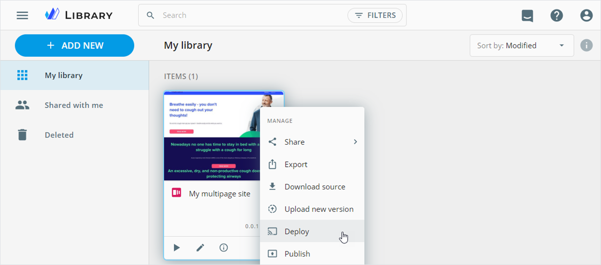 Upon successful creation or upload, your multipage site appears in Library.