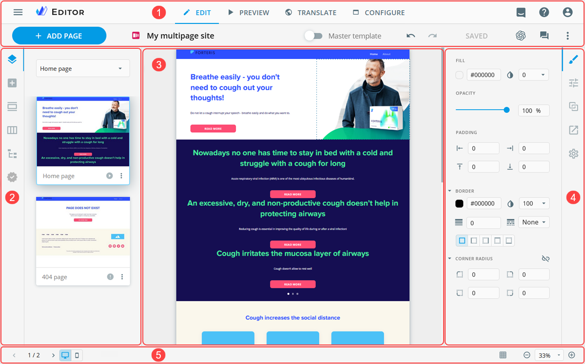 The multipage site Editor opens in a new browser tab and consists of the following areas:
