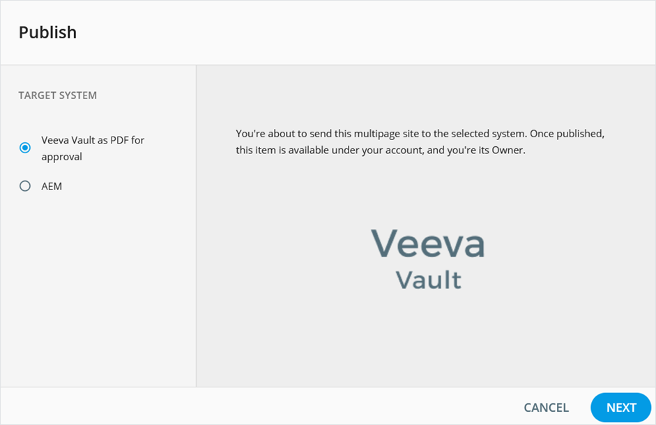 The multipage site publishing is initiated with the Publish option from the more menu. Select the target system and follow the publication steps.