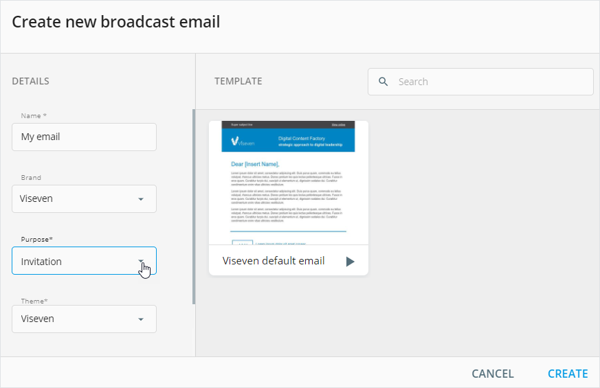 Now, you can create an email of a definite subtype: invitation, confirmation, follow-up, or reminder. The selection of the required purpose predefines the set of blocks in your email.